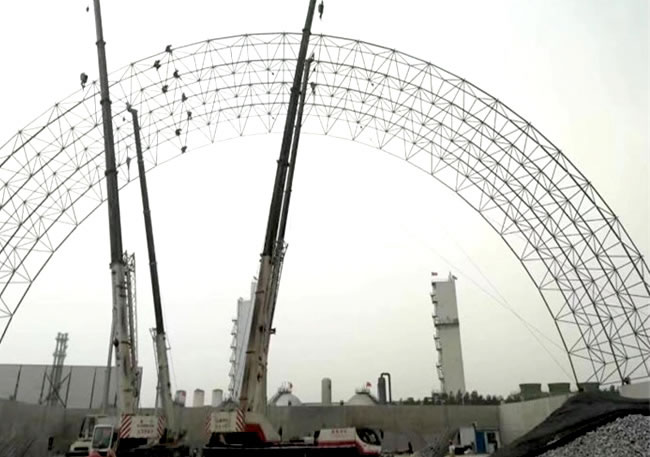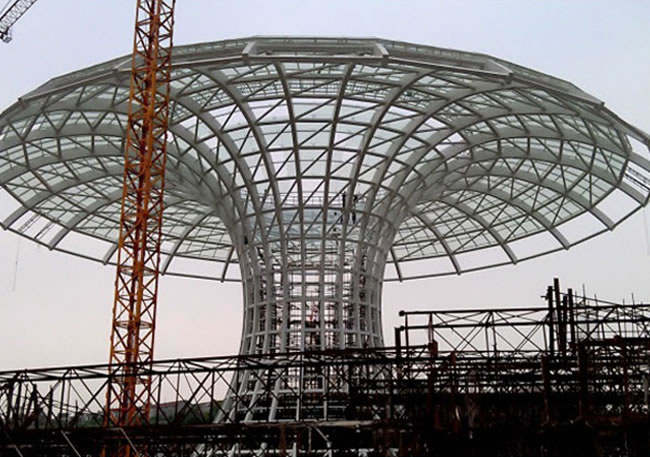 球形網架施工方案  1、工程概況和總體部署  網架采用正放四角錐形式,采用螺栓球接點,采用普通鋼管材,采用兩側焊接水平支座。  網架采用聚碳酸酯屋面,采用小立柱找坡的單向內排水方式,天溝鋼板厚度6mm。  2...